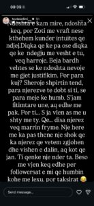 “Ndoshta e kam mire, ndoshta keq, por Zoti me vraft nese kthehem kunder intuites qe ndjej.Diqka qe ke pa ose diqka qe ke ndegju me vesht e tu, veq harroje. Beja bardh vehtes se ke ndoshta nevoje me gjet justifikim. Por para kuj? Sheroje shpirtin tend, para njerezve te dobt si ti, se para meje ke humb. S’jam fitimtare une, aq edhe me pak. Por ti… S ja vlen as me u shty me ty. Qe… disa njerez veq marrin fryme. Nje here me ka pas thene nje shok qe ka njerez qe vetem zgjohen dhe vishen e dalin, aq kot qe jan. Ti qenke nje nder ta. Beso me vjen keq edhe per followersat e mi qe humbin kohe me lexu, por taksirat”./Indeksonline/